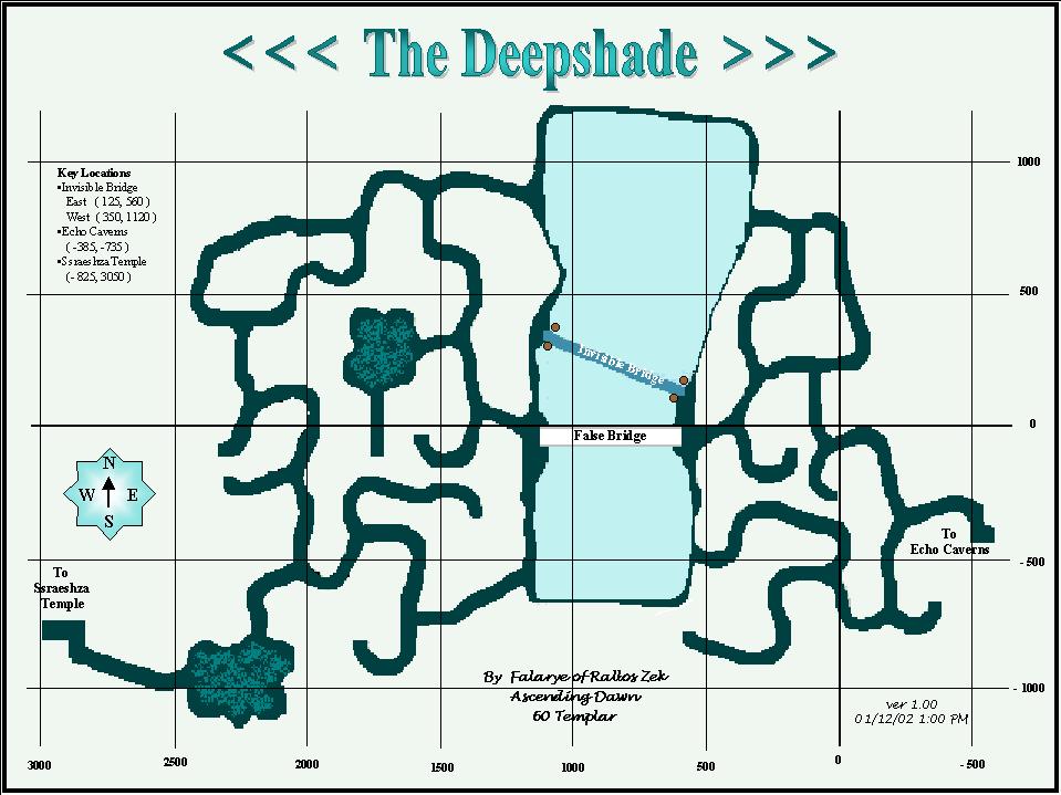 || Strategy DescriptionThe Deep is an especially deep network of caverns on Luclin, which is rumored to be very deadly. DangersThere is a deep Abyss, a pit of unfathomable depth, deep within this network of caverns. There is a large bridge that passes over this, however the bridge is an illusion, and stepping on it will lead to a very nasty (and likely lethal) fall to the bottom of the Abyss. BenefitsUnknown Travelling To and From The DeepThe entrance to the Deep is through the southern section in Echo Caverns. The Deep connects to Ssraeshza Temple through a passage deep within it. Although the passage itself is not one way, shortly into the Temple you will pass through a one-way door and not be able to go back to the Deep. |